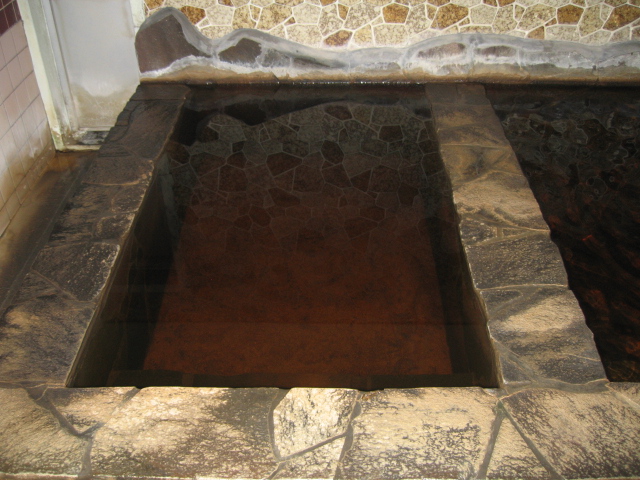 泉質は温泉分析書が見当たらず解らないが、黄褐色の透明な湯と微かな玉子臭、