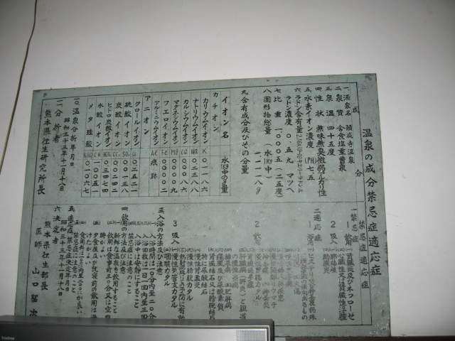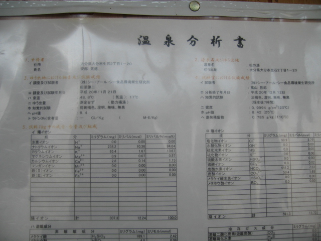 飲泉すると甘塩味があったのでおそらく硫酸塩を含んだ炭酸水素塩・塩化物泉で