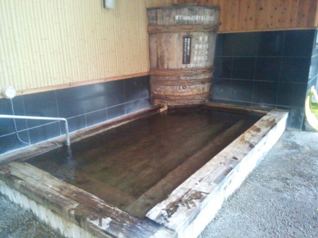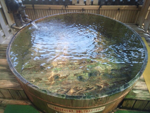次は露天風呂。手前が水風呂で、中央に樽風呂、奥に岩で囲われた露天風呂がある。