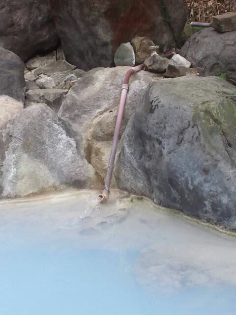 湯温は塩ビ管から注がれる湯量で調節される。前回伺ったときは湯温が熱すぎてじっくり