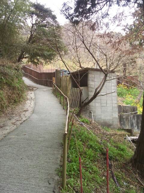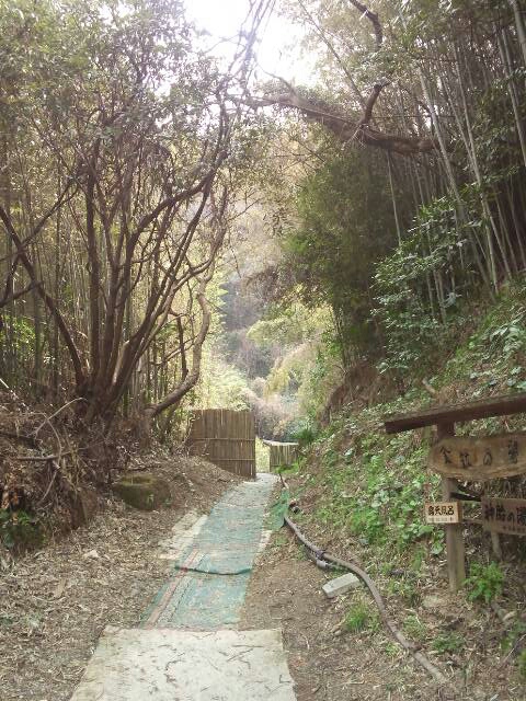 金鉱の湯は木々に囲まれた左側の道を進んでいく。まだ若い?ウグイスの囀りが谷に響き、