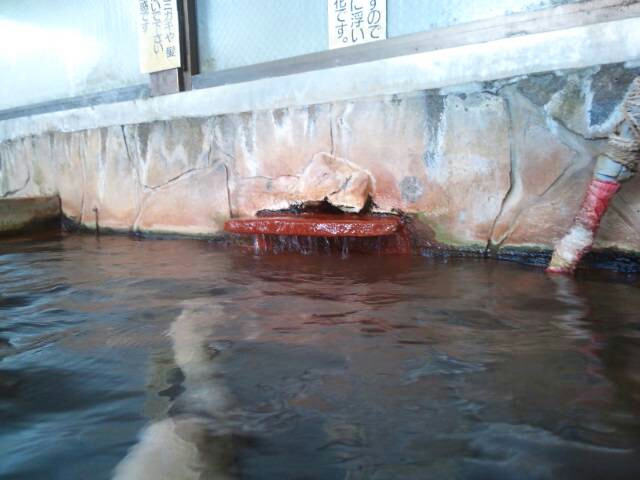 湯船の縁や湯口は赤色の析出物でみごとにコーティングされている。