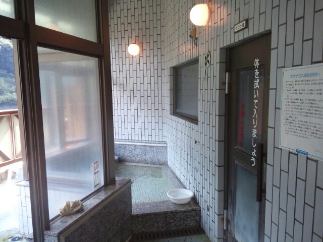 やや深い左側の湯船は仕切りの切れ目から湯が流れ込むのでぬるい。