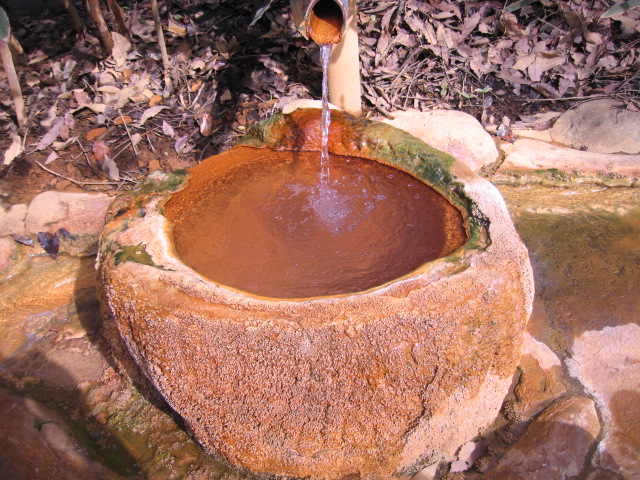 黄褐色の濁り湯で、湯面には微硫黄臭と金気臭が漂う。飲泉では炭酸水素イオンの酸味と甘み、