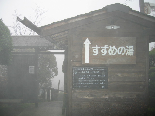 ガスを掻き分け?進むと「すずめの湯」の案内板。階段を下っていくと眼下に湯場が見えてくる。