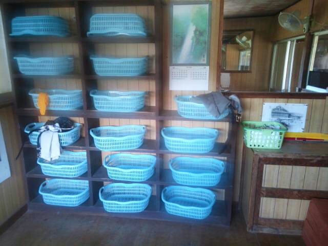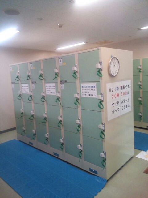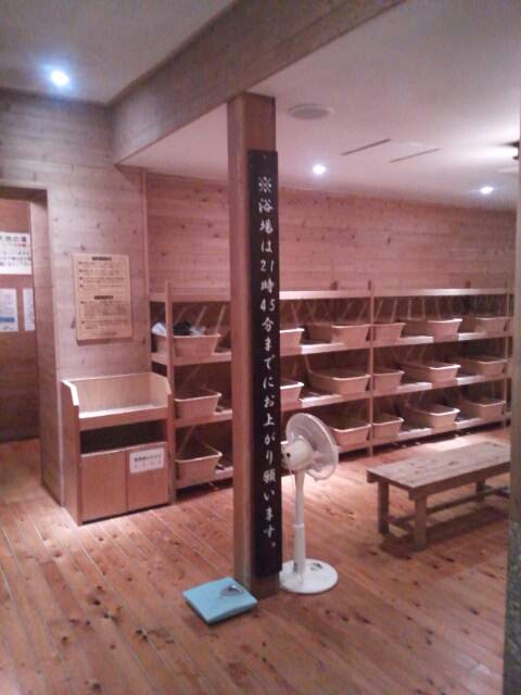 男女湯は固定式になっている。男性側の脱衣場は木目を活かした落ち着いた雰囲気