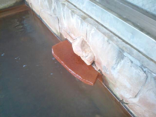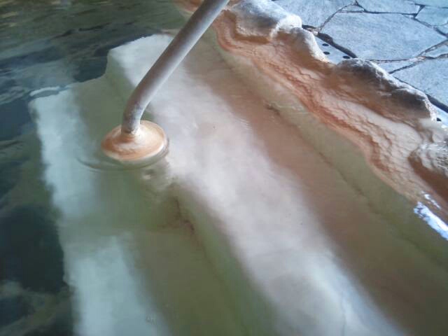 石灰華した析出物がお見事である。 源泉掛け流しでこれだけ無色透明な湯が湯船に