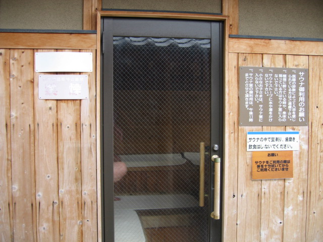 露天には珍しい遠赤サウナがあり、利用者が使うときに持ち入れるサウナマットが入口の棚に