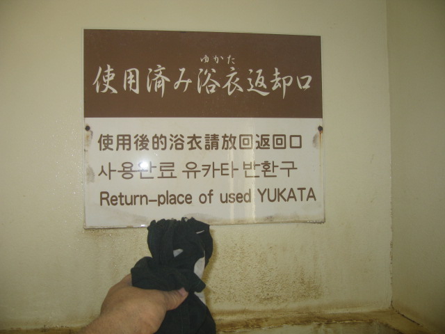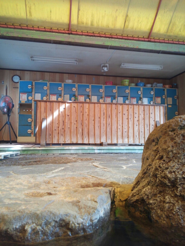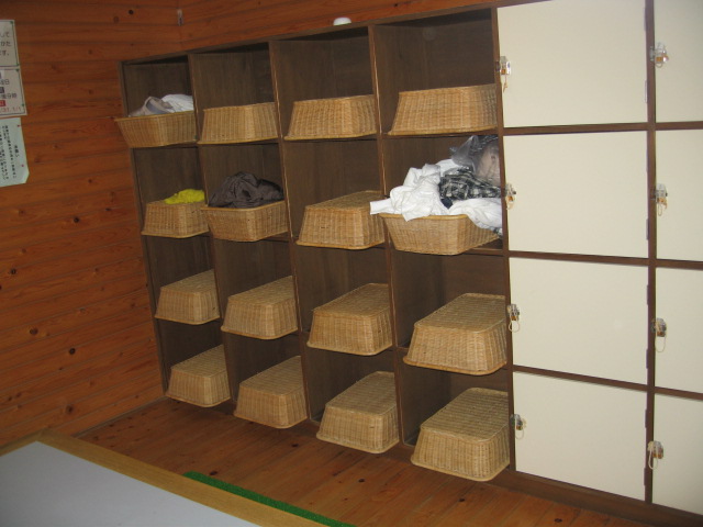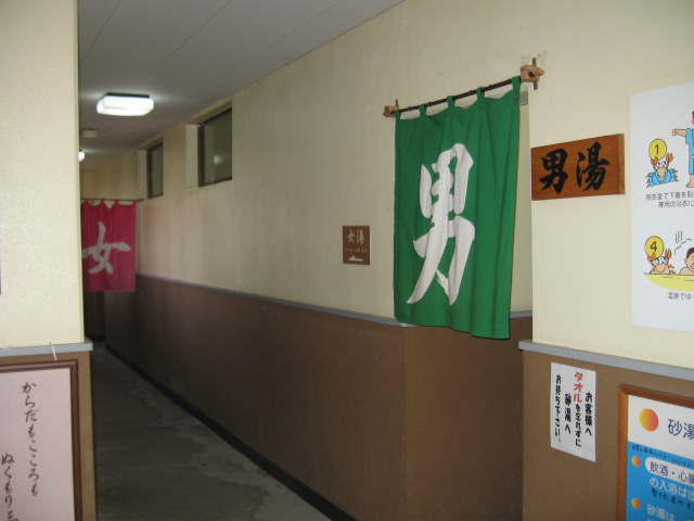 脱衣室のロッカーに衣類を押し込み、青い大きめの浴衣(女性は赤)に着替えて砂場に向かう。