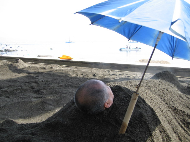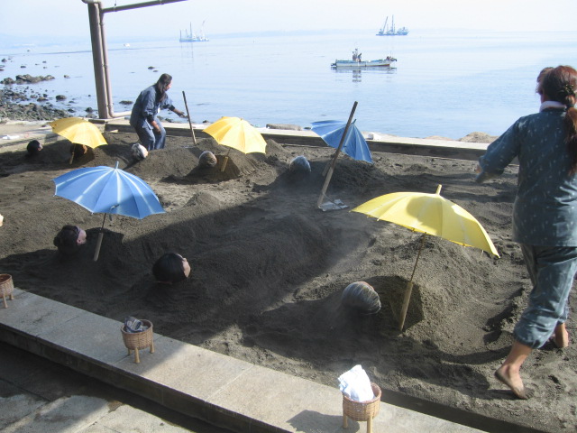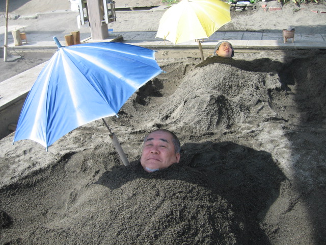 頭だけ出した状態で生き埋めされていた。手前の砂場は温泉に浸されていて湯気を上げている。
