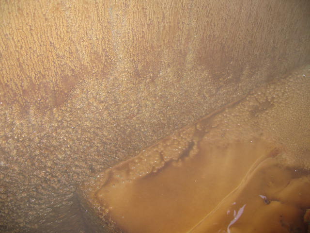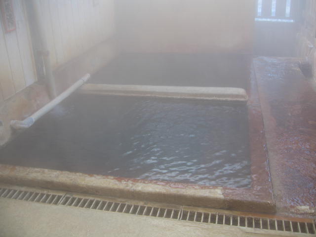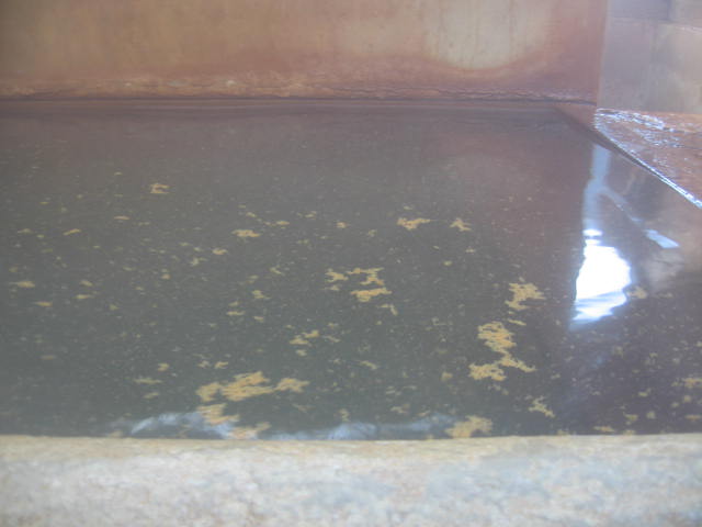 鉄イオンが含有した茶褐色の析出物が湯船全体に付着しているが、独自の自家源泉を足元湧出