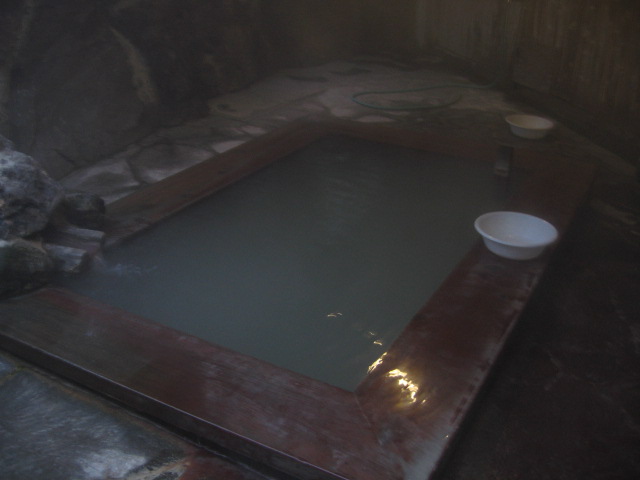 「すずめの湯」よりやや淡青白色の大人しい湯質で、微細な白い湯の華が湯中で乱舞している。