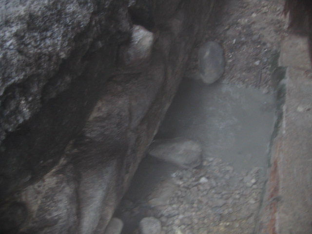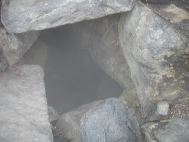 ガスを掻き分け?進むと「すずめの湯」の案内板。階段を下っていくと眼下に湯場が見えてくる。