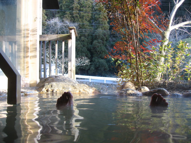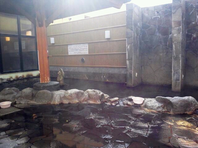 露天風呂は熱い湯もぬるい湯も入湯者でいっぱい!流石である。ペットボトル片手に入浴する