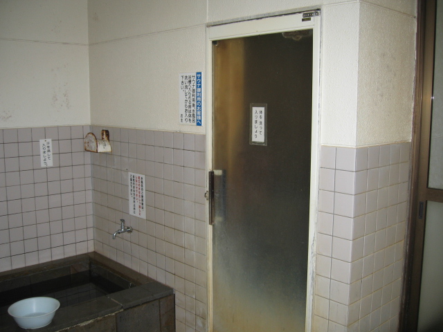 砂湯を終えてから浸かる湯舟がサッシドアの奥に見える。衣服を脱ぎ