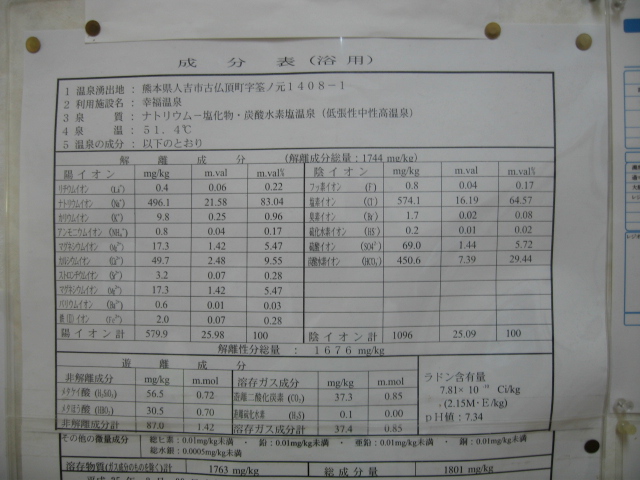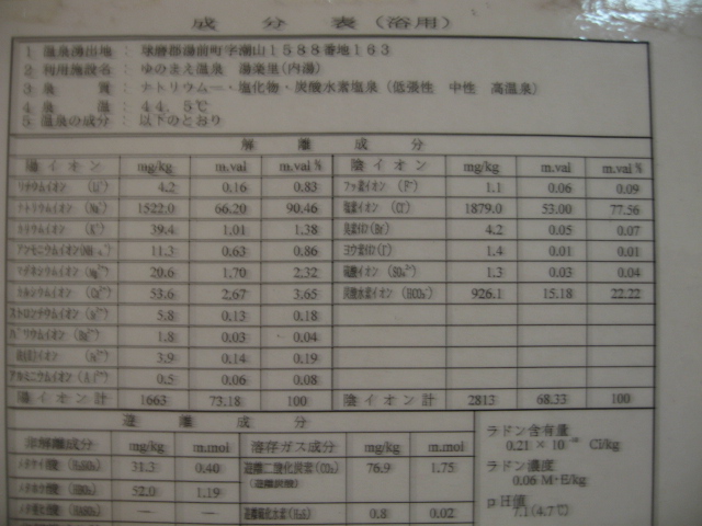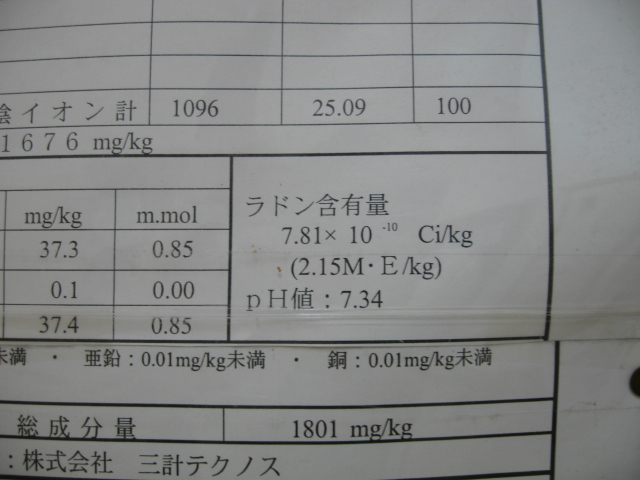 陰イオン CL- : 7949mg/kg SO4- : 77.5mg/kg HCO3- : 69.8mg/kg