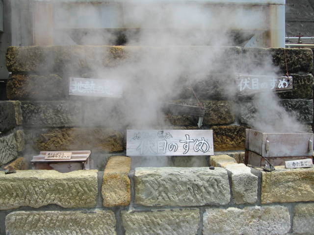 施設内には温泉蒸気を利用する蒸し器や無料の休憩所がある。