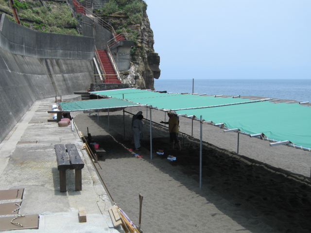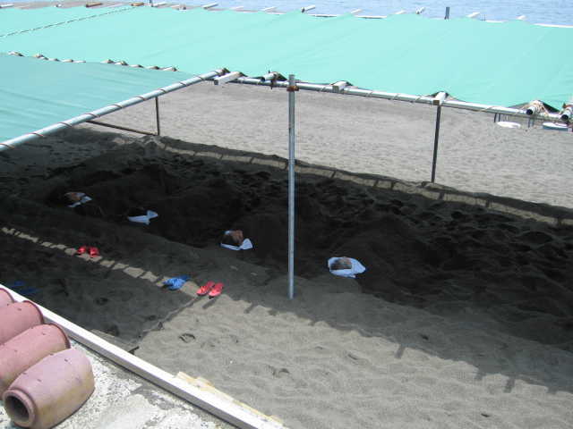 今回お世話になったのが屋根付きの砂湯場。先客4名が砂かぶり状態だ。
