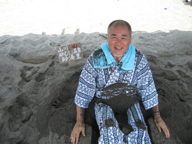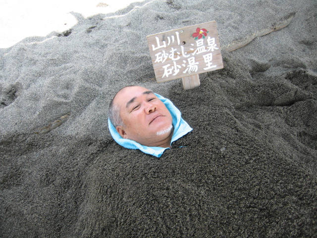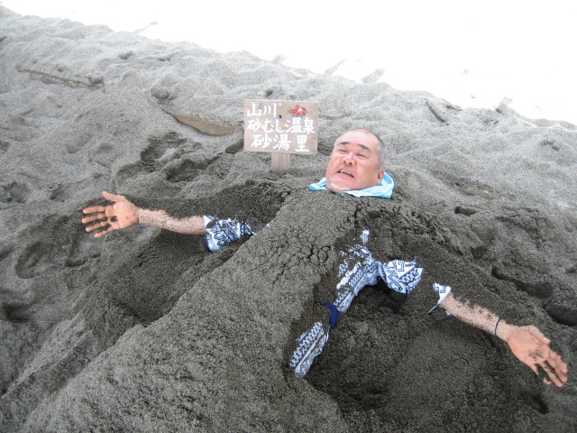 早速僕も若い男性砂かけ師2人にホカホカの砂をかけてもらう。